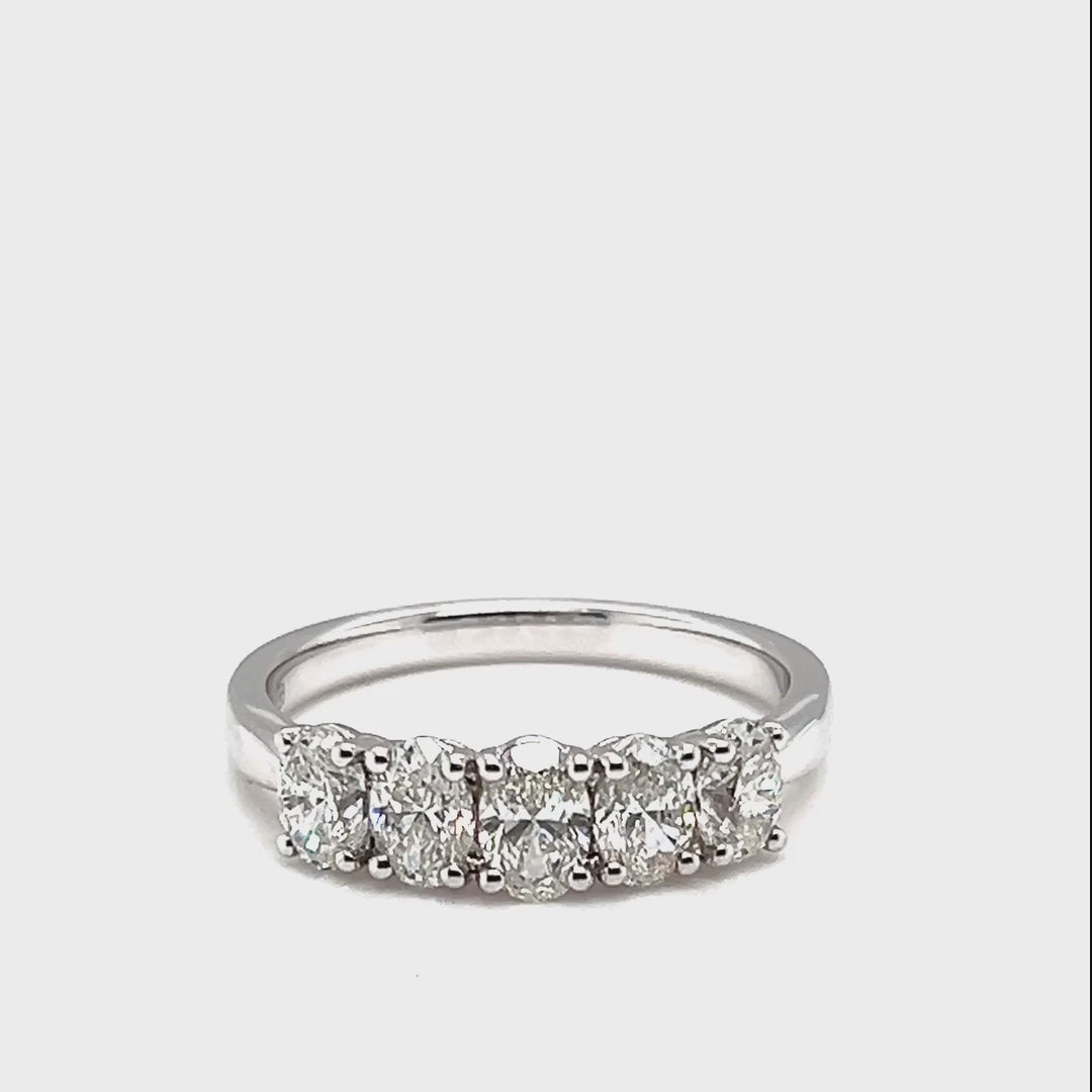 Presenting our dazzling 5 stone Oval Cut Diamond Ring containing an astonishing 1.17ct total. Boasting a glamorous look, this easy-wearing masterpiece is crafted in 18k White Gold and will be adorned by its beholder for a lifetime.