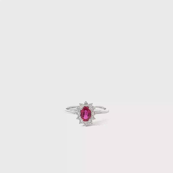 18k White Gold Oval Cut Red Ruby Halo Ring