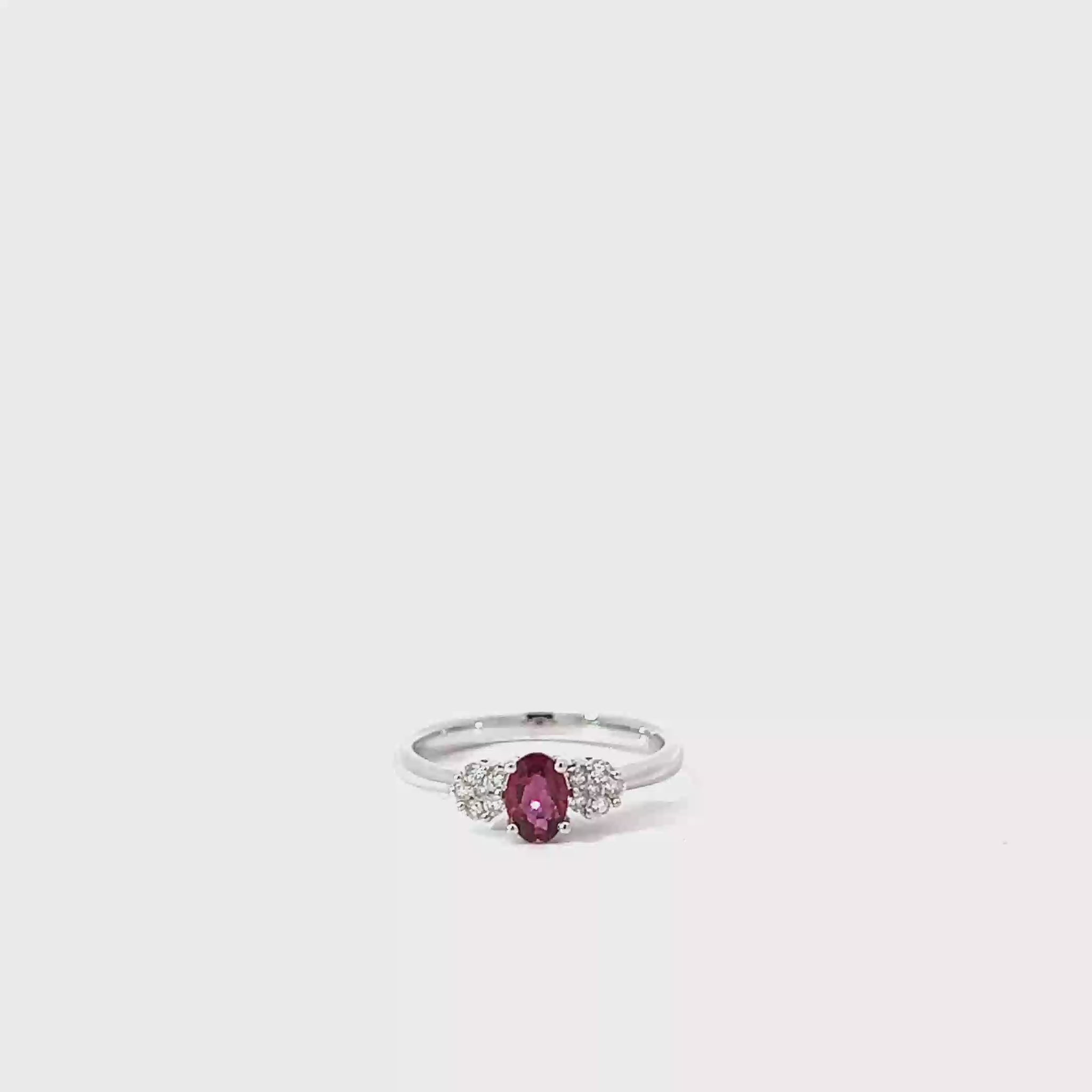 18k White Gold Oval Cut Red Ruby Trilogy Ring. SKU:21-01-353
