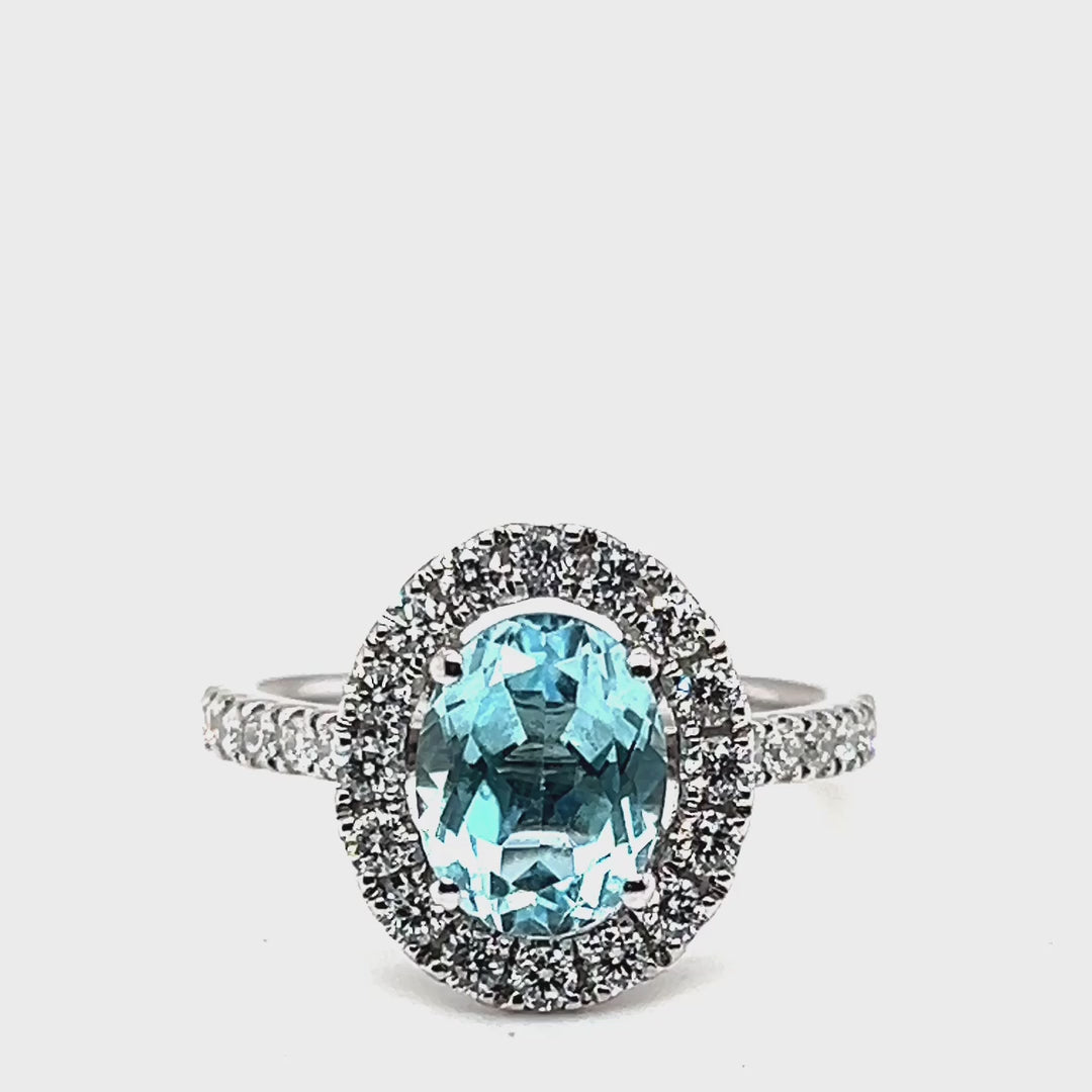 Crafted in Platinum our 2.38ct Oval Sky Blue Topaz is flanked with stunning round brilliant diamond set shoulders & a glamorous diamond halo. This luxurious ring is sure to make a stunning statement with its effortless versatility, allowing it to be worn to any occasion.