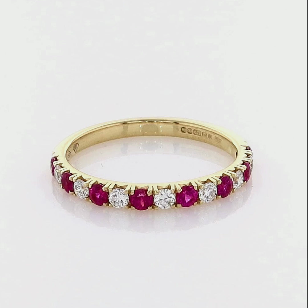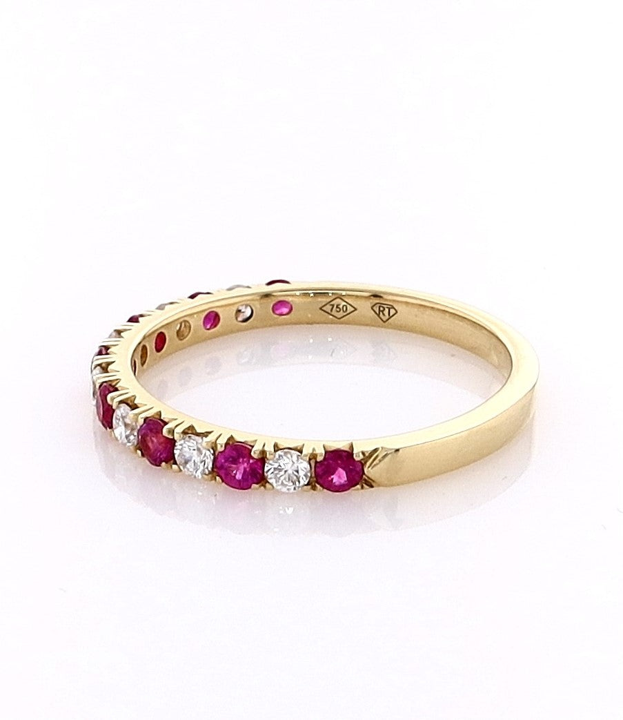Crafted from 18k yellow gold, this Ruby & Diamond Eternity Ring is for those searching for a wedding band of vivid and individual character, a daily-wear piece, or simply a ring to complete their ensemble. Offering a glistening appeal with a delightful pop of color, it delivers a luxurious and unique solution.