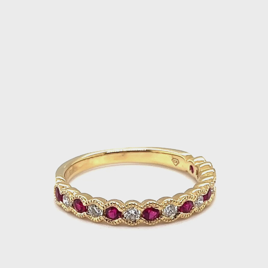 Experience elegance and luxury with our beautiful Ruby & Diamond Ring. This stunning piece is meticulously set in an 18k Yellow Gold millegrain setting, creating a timeless and sophisticated look perfect for any occasion. The perfect way to elevate your style and showcase your refined taste.