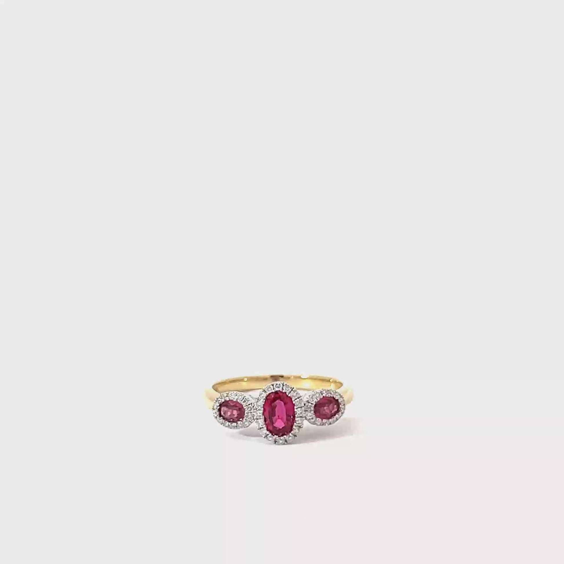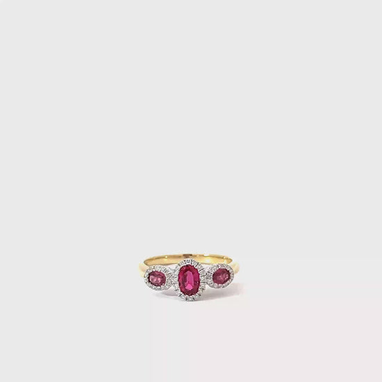 18k Yellow & White Gold Oval Cut Red Ruby Trilogy Halo Ring. SKU:21-01-357