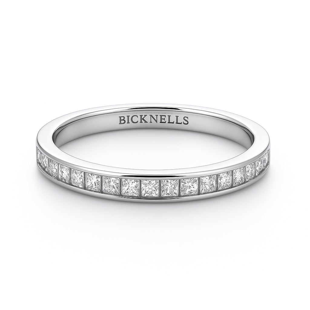 Our classic Eternity ring half-set in a channel setting with Princess cut diamonds.
