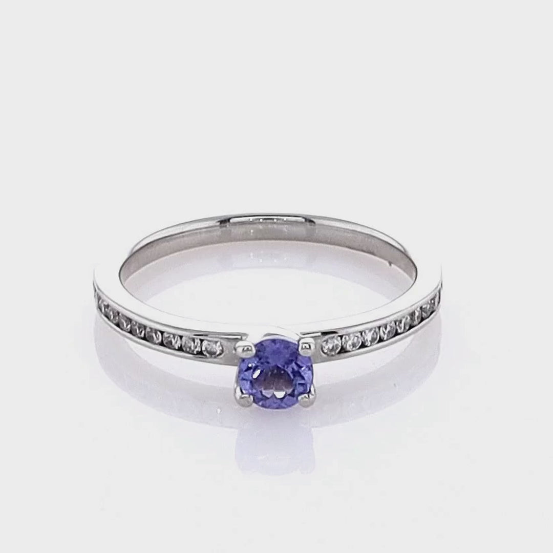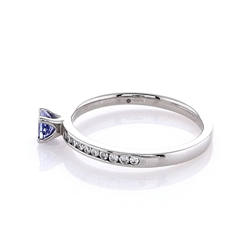 A beautiful modern design consisting of a 0.25ct Round Tanzanite centre with 0.15ct Round Brilliant diamonds set in a channel along the shoulders. A beautiful design in Platinum that captures a stunning subtle sparkle. A perfect ring for any occasion.